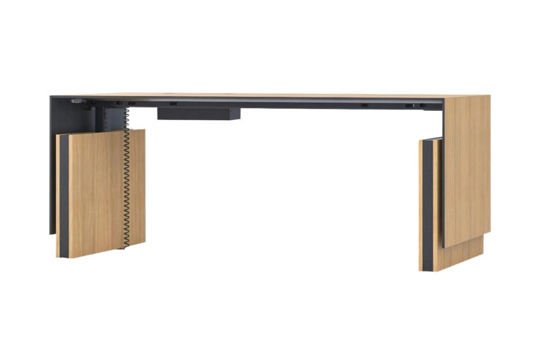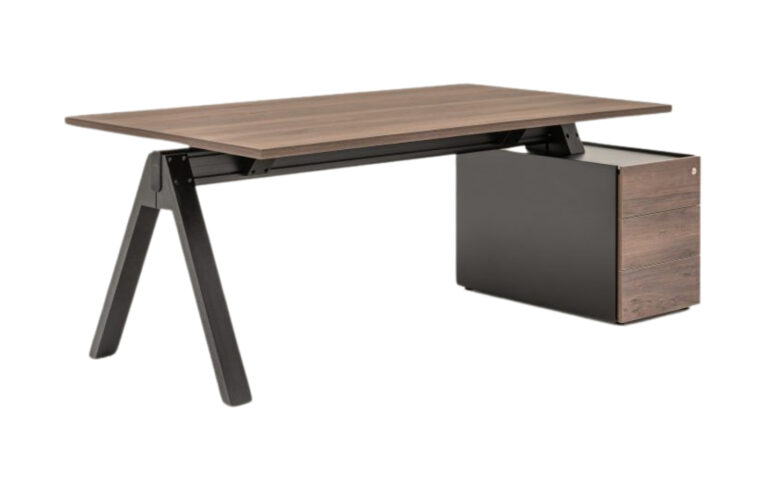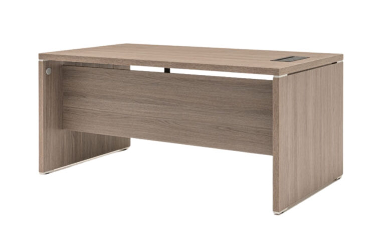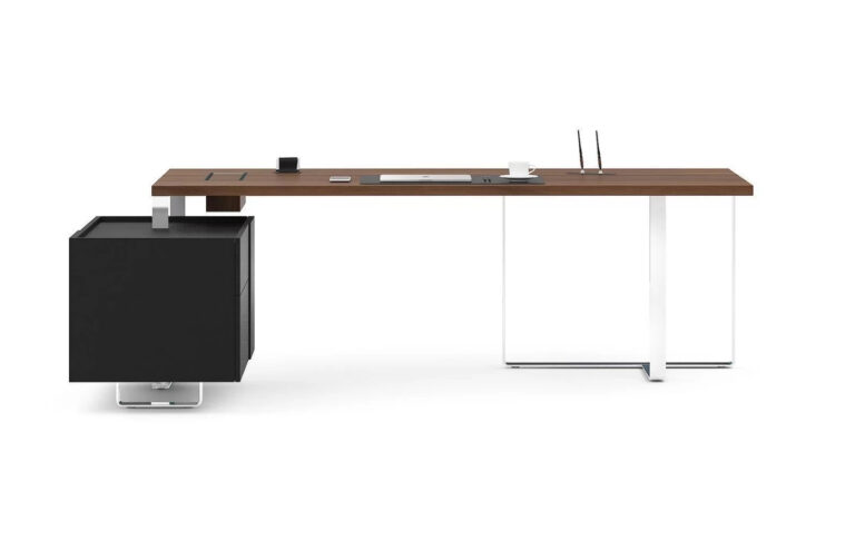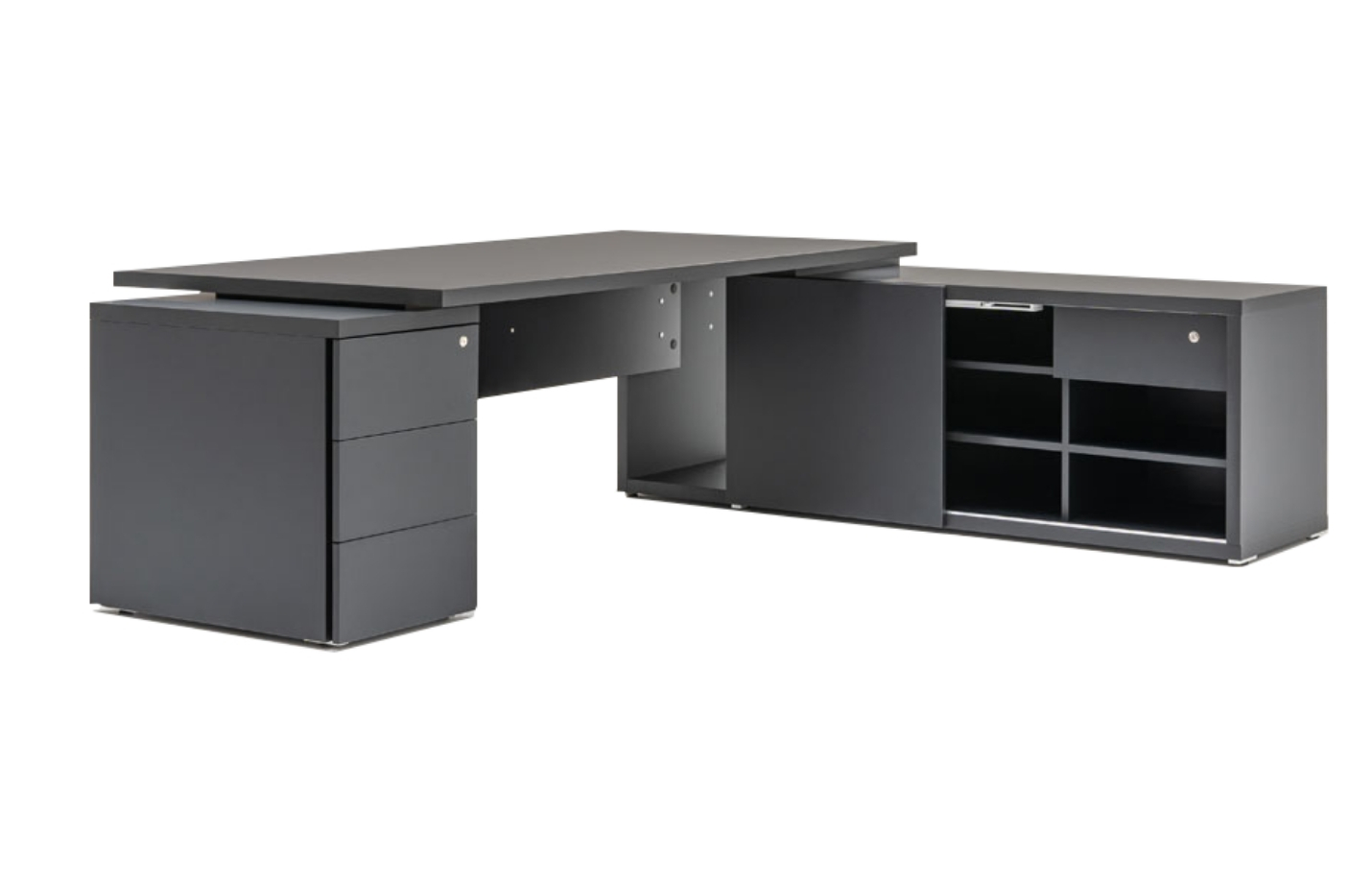 Note: Optional accessories include mediaboxes and a leather pad—available upon request. Pedestal and managerial storage are available on both right and left sides. Desk without pedestal is also available.