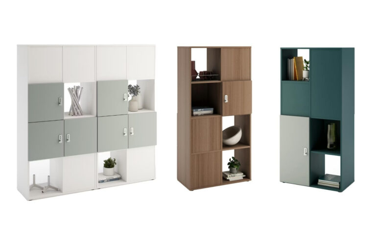 Note: Freestanding system for storage, zoning, and display. Configurable with cabinets, shelves, drawers, and planters. Features tool-free back panel installation, soft-close drawers, and adjustable feet. Accessories include planter boxes, cable trays, baskets, and screen holders.