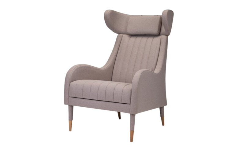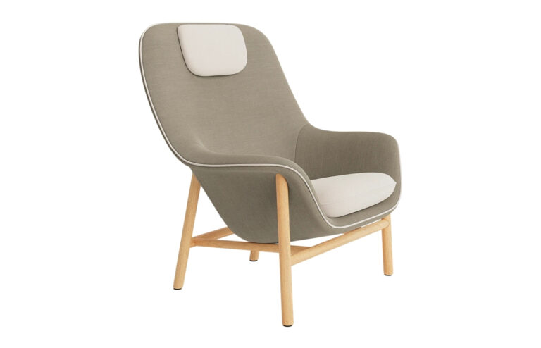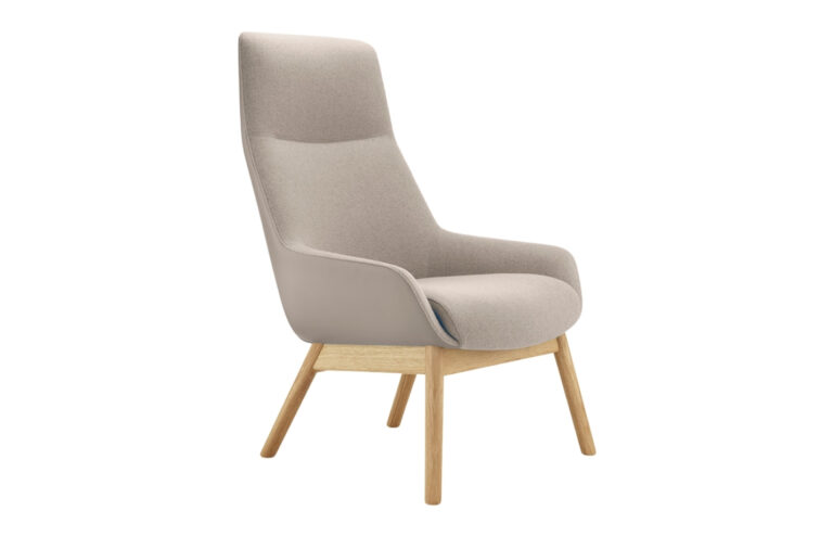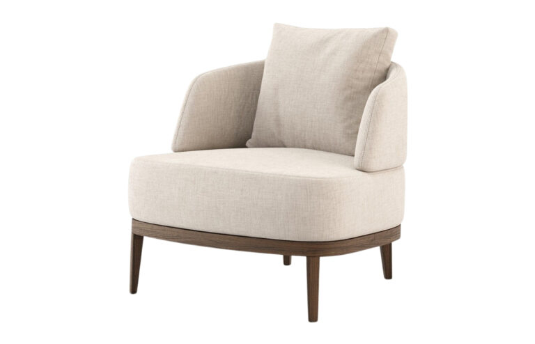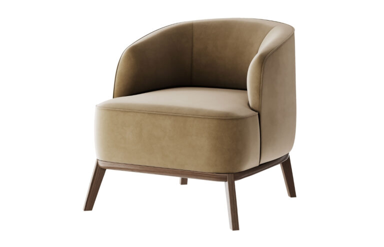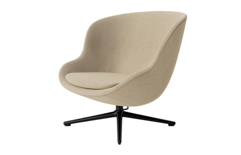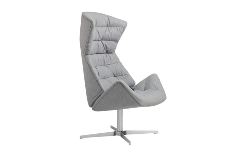 Material: Fully upholstered cushioned shell in fabric or leather; hidden inset swivel base in polished or brushed metal