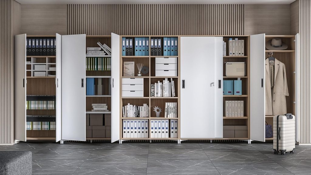 Office storage furniture including cabinets and shelving units to keep workspaces tidy.